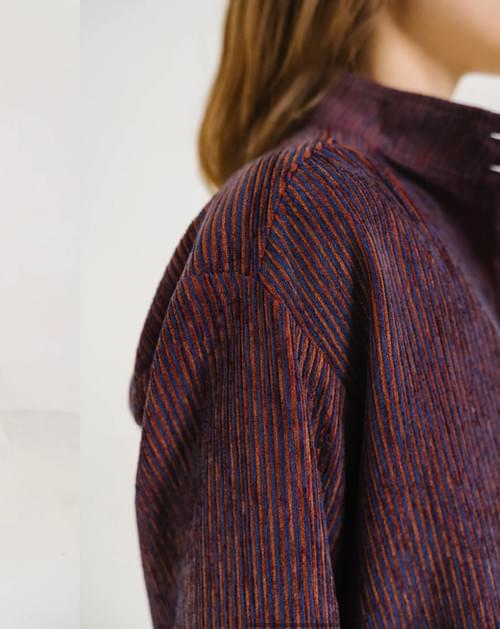 Blouse à col montant, confectionnée en velour rayé rouge et bleu. Sa coupe ample et ses emmanchures basses lui confèrent une allure fluide et décontractée. Froncée à l’avant et au dos, elle est soulignée par une patte polo et des bas de manches fermés par un bouton, pour une finition subtilement féminine.