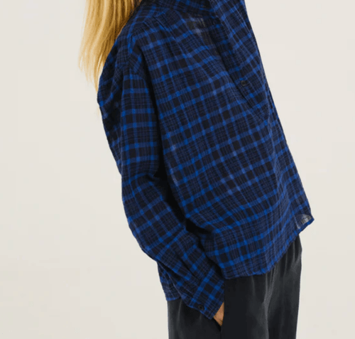 Chemise à carreaux noir et bleu, cconfectionnée dans un mélange de coton et viscose à petit carreau bleu et noir. Son col esprit vareuse, ses emmanchures basses et ses fentes côtés lui confèrent une allure décontractée et contemporaine. Les fausses poches poitrine et l’absence de boutonnage soulignent son style épuré et minimaliste.