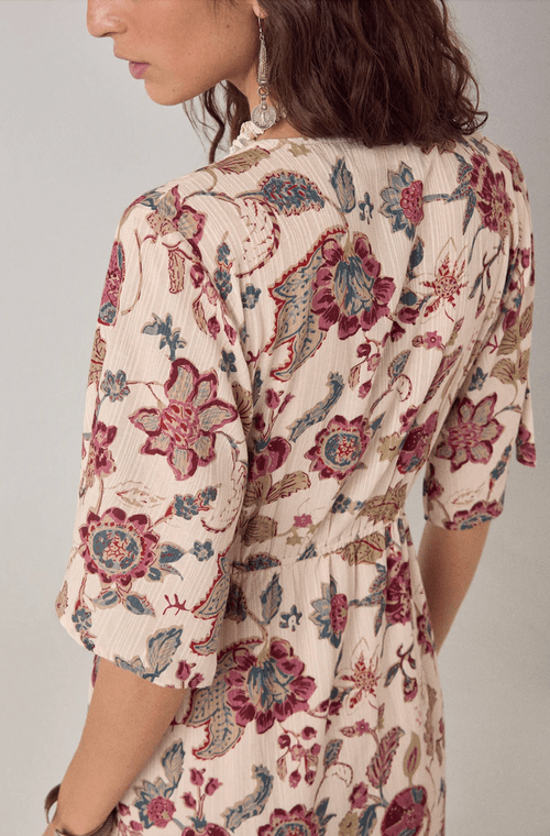Robe à col V froncé aux épaules, manches kimono courtes, ceinture à nouer. Jupe maxi à deux volants entre les volants. Confectionnée en viscose rayée à la texture côtelée subtile qui capte la lumière. Imprimé floral cachemire sur l'ensemble de la robe.
