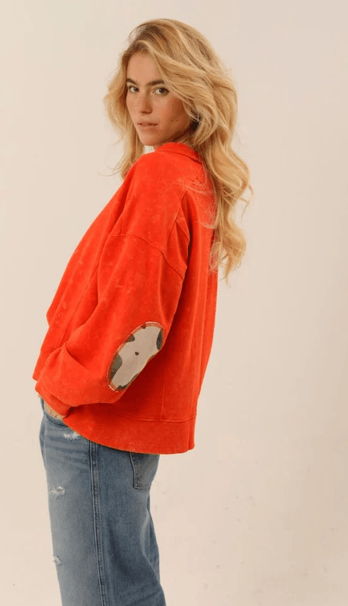 • Rouge/orange : molleton rouge-orange vif, coudières imprimé léopard, bords-côtes rouges