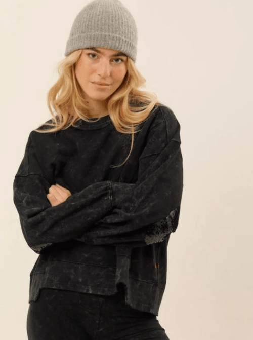 • Noir : molleton uni noir, empiècements sequins noirs aux coudes, surpiqûres ton sur ton, bords-côtes noirs